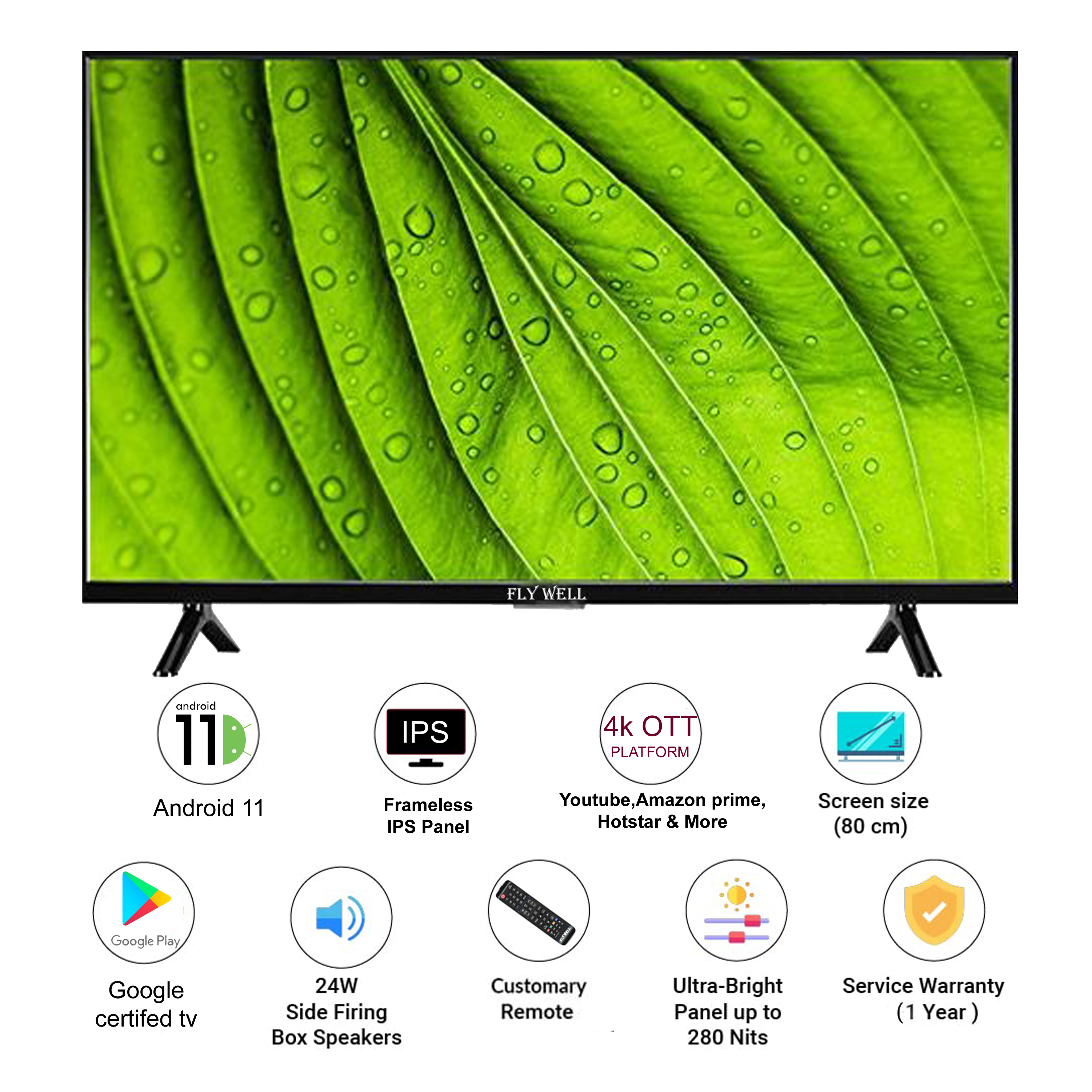 32 Android TV (4KUHD, Bluetooth, IPS panel, Google play store, Android 11, YouTube, Netflix, Amazon prime, Hotstar & more OTT apps )