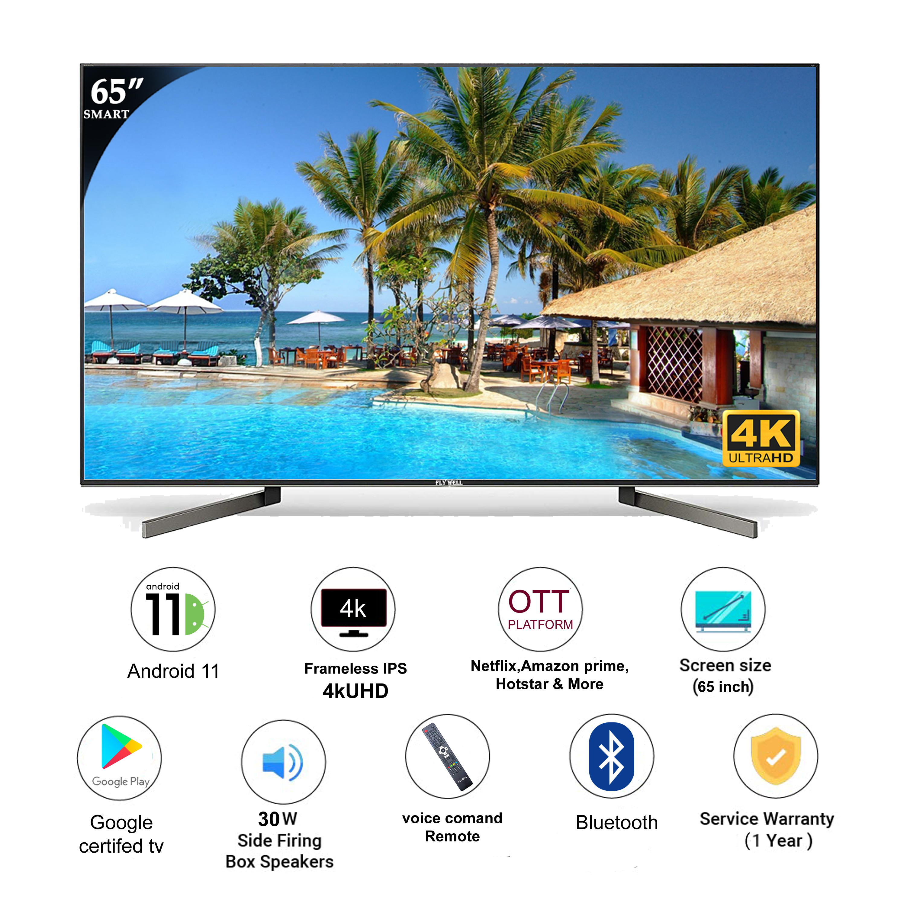65 Android TV (4KUHD, Bluetooth, IPS panel, Google Play Store, Android 11, YouTube, Netflix, Amazon…